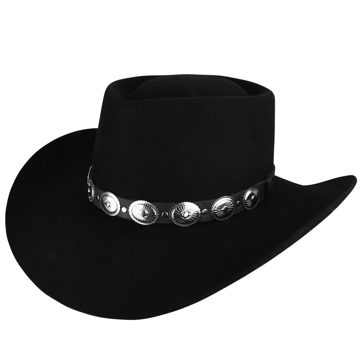 The Ellsworth is a teardrop crown, with a classic shaped 3 1/2" brim. In black it comes with a black and silver concho band, and in mist it comes with a brown genuine leather and silver concho band, giving it an Old West feel.